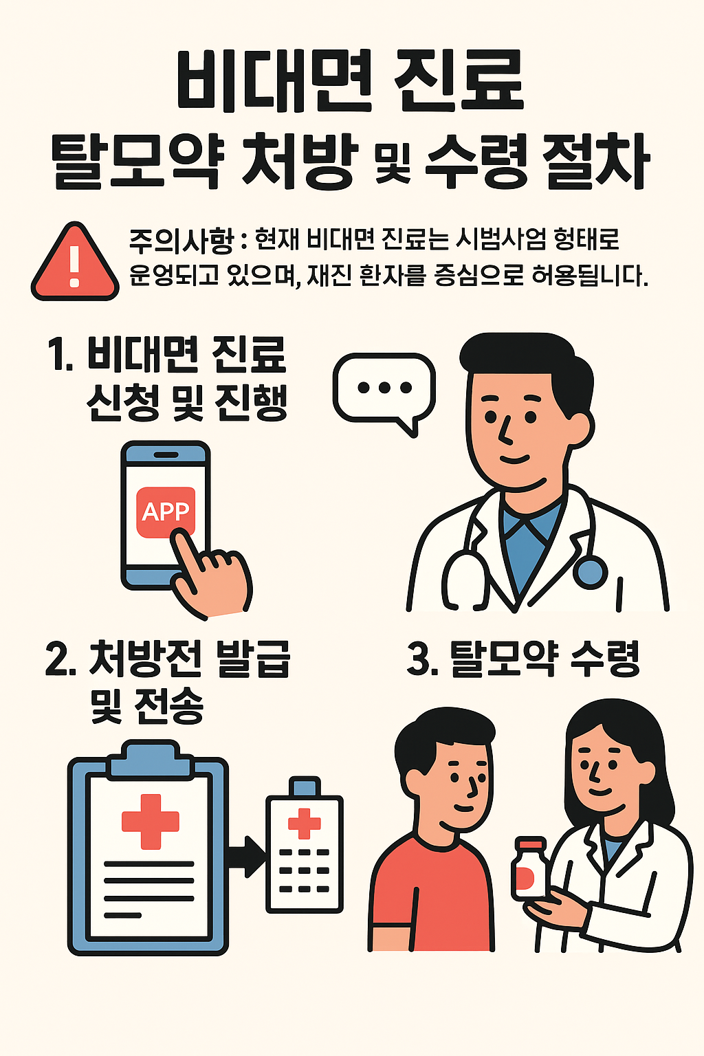 현재 비대면 진료는 시범사업 형태로 운영되고 있으며, 재진 환자를 중심으로 허용됩니다. 처방된 약은 원칙적으로 환자 본인 또는 대리인이 약국에 직접 방문하여 수령해야 합니다. (일부 예외 대상자에게만 약 배송이 허용될 수 있습니다.