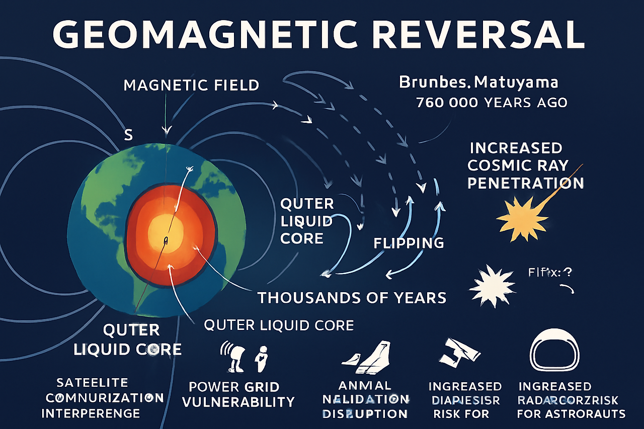 지구 자기장 역전은 지구 내부 역동적인 과정의 자연스러운 현상으로, 수백만 년 동안 여러 차례 반복되어 왔습니다. 역전 과정에서 자기장이 약해지면서 우주 방사선이 지구에 더 많이 유입될 수 있지만, 인류 문명에 미치는 영향은 현재 기술 수준에서 충분히 대응 가능한 범위로 평가됩니다.