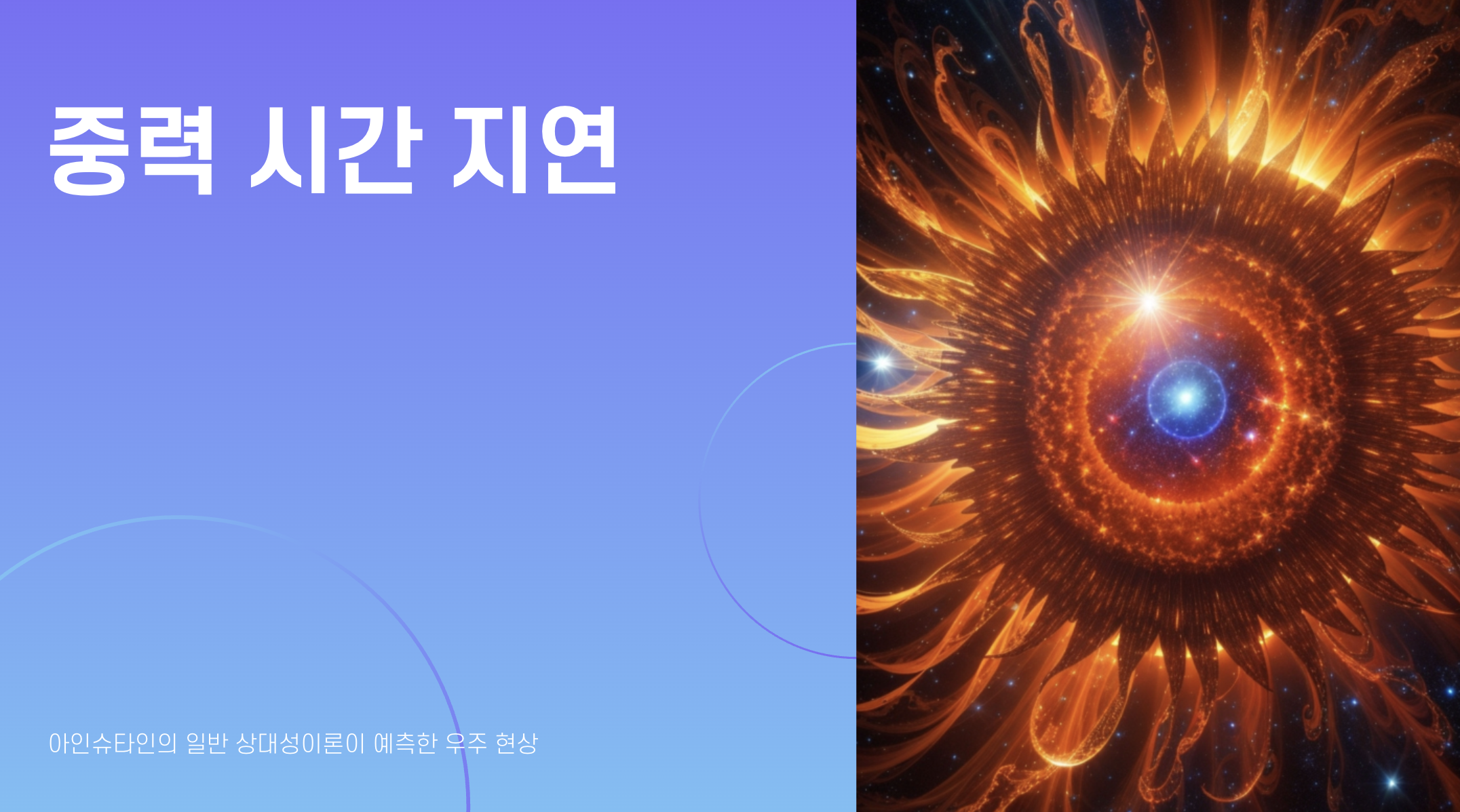 중력 시간 지연은 중력이 강한 천체 근처에 있을 때, 그 장소의 시간이 외부 관찰자에 비해 느리게 간다는 현상입니다. 즉, 블랙홀 근처나 중력이 센 행성 표면에 있으면 시간이 더 천천히 흐른다는 뜻입니다.